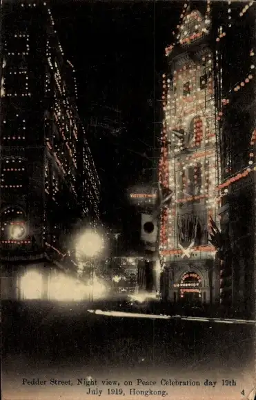 Ak Hongkong China, Pedder Street, night view, Peace Celebration Day 1919