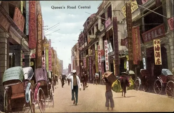 Ak Hongkong China, Queen's Road Central, Rikschas