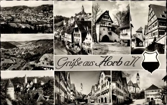 Ak Horb am Neckar, Wappen, Panorama, Kirche, Fachwerkhäuser