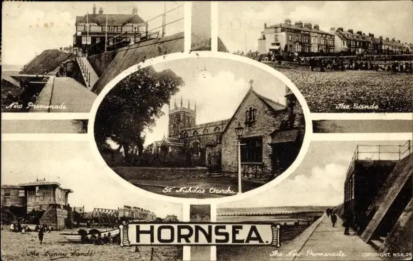 Ak Hornsea Yorkshire, The Sands, Promenade, St. Nicholas Church