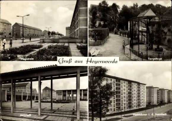 Ak Hoyerswerda in der Oberlausitz, Tiergehege, Hochhäuser in der Neustadt, Magistrale