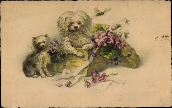 Ak Hunde und Biene, Flechtkorb, Blumen