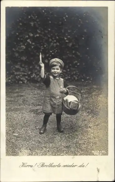 Ak Hurra, Brotkarte wieder da, Kleines Kind mit Brotkorb