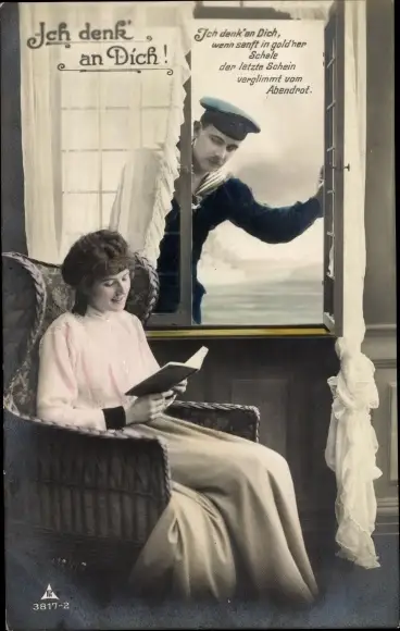 Ak Ich denk' an Dich, Seemann am Fenster, lesende Frau