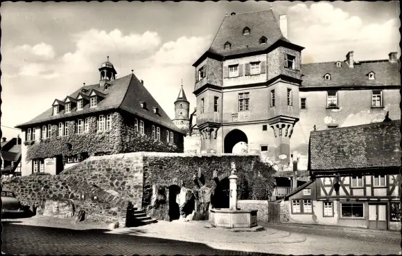 Ak Idstein im Taunus Hessen, Löwenbrunnen, Rathaus, Hexenturm