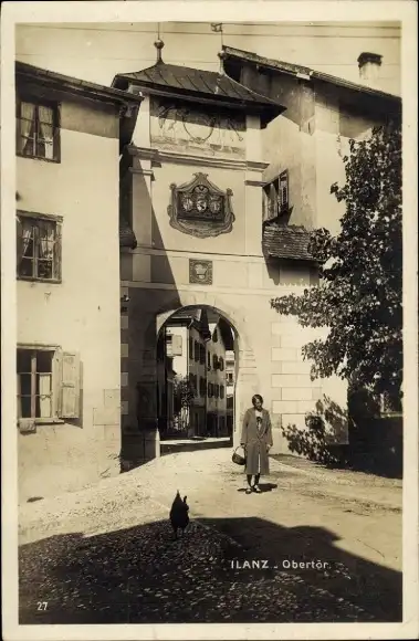 Ak Ilanz Glion in Graubünden, Obertör, Architektur, Sommerstimmung, Katze im Vordergrund