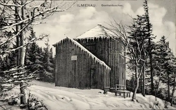 Ak Ilmenau in Thüringen, Goethehäuschen auf dem Kickelhahn, Winter