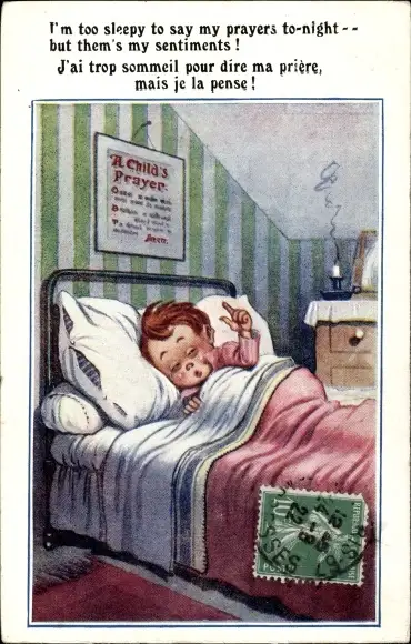 Ak I'm too sleepy to say my prayers tonight, Junge im Bett