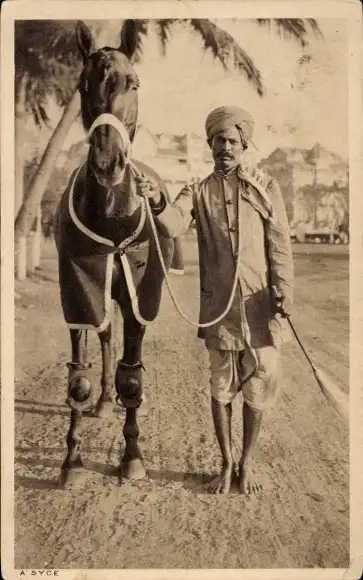 Ak Indien, Mann mit Pferd, Porträt, Zaumzeug