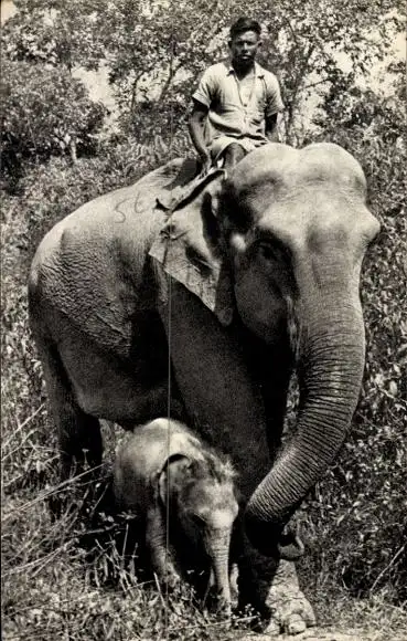 Ak Indischer Elefant mit Kalb, Mahut