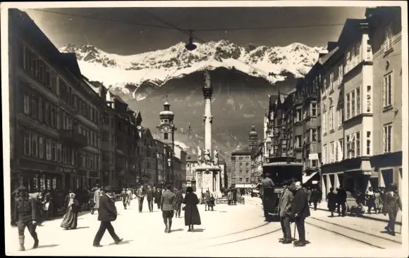 Ak Innsbruck in Tirol, Maria Theresien Straße mit Annasäule, Straßenbahn