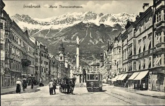 Ak Innsbruck in Tirol, Maria Theresienstraße, Straßenbahn, Kutsche, Geschäfte, Säule