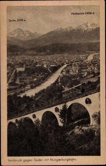 Ak Innsbruck in Tirol, gegen Süden mit Hungerburgbahn, Serles, Nockspitze