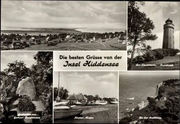 Ak Insel Hiddensee in der Ostsee, Leuchtturm, Dornbusch, Steilküste, Kloster, Hafen, Grabstätte