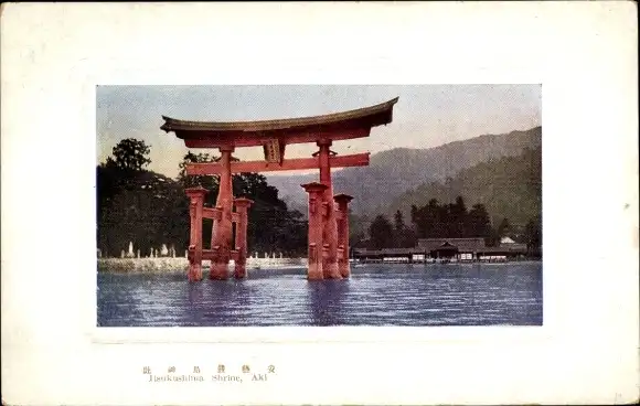 Ak Insel Itsukushima Japan, Torii Tor, Wasser, Berge im Hintergrund, Japanische Architektur