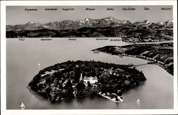 Ak Insel Mainau im Bodensee, Luftbild der Insel, Gebirge, Säntis