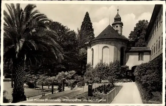 Ak Insel Mainau im Bodensee, Phönixpalme, Schlosskirche