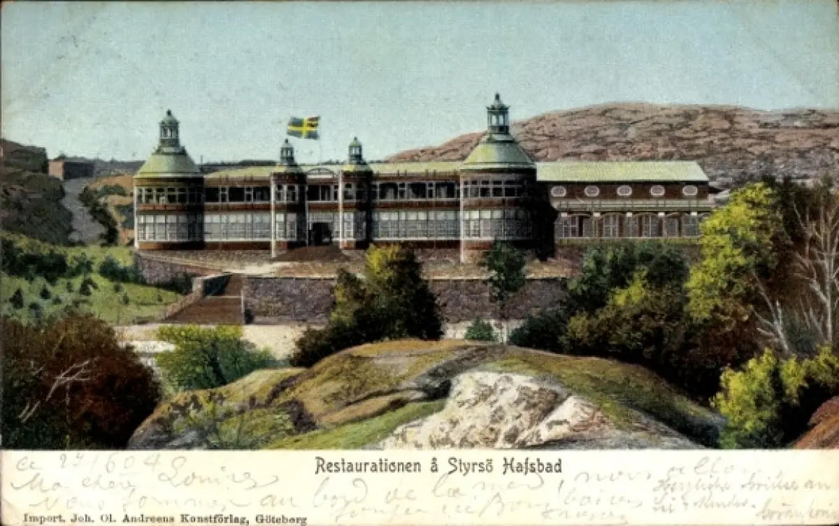 Ak Insel Styrsö Göteborg Schweden, Restaurationen schwedische Flagge, Natur, Gebäude