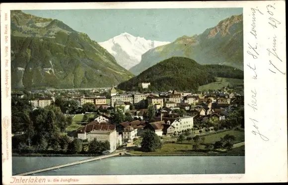 Ak Interlaken Kanton Bern Schweiz, Totalansicht mit der Jungfrau
