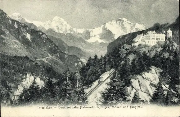 Ak Interlaken Kt. Bern Schweiz, Drahtseilbahn Heimwehfluh, Eiger, Mönch, Jungfrau