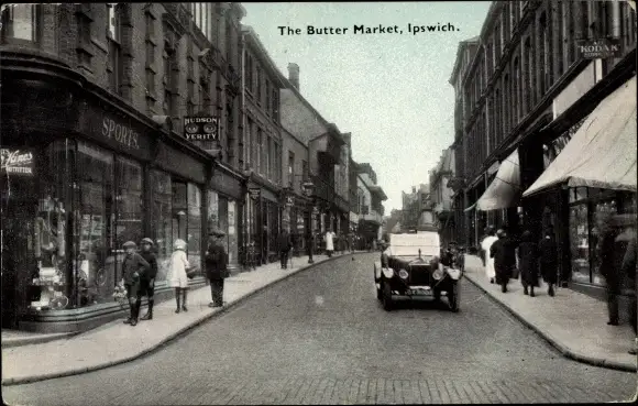 Ak Ipswich Suffolk, The Buttermarket, Automobile, Shops