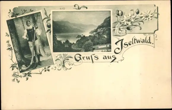 Ak Iseltwald Kanton Bern, Mann in Tracht mit Alphorn