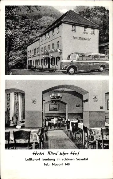 Ak Isenburg im Sayntal Westerwald, Hotel Wied'scher Hof, Innenansicht, Autobus