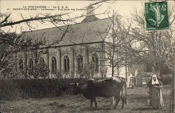 Ak Isigny sur Mer Calvados, Le Couvent, vue prise des Jardins, vache, femme de lait