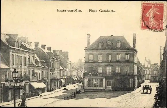 Ak Isigny sur Mer Calvados, Place Gambetta, Ygouf Patissier