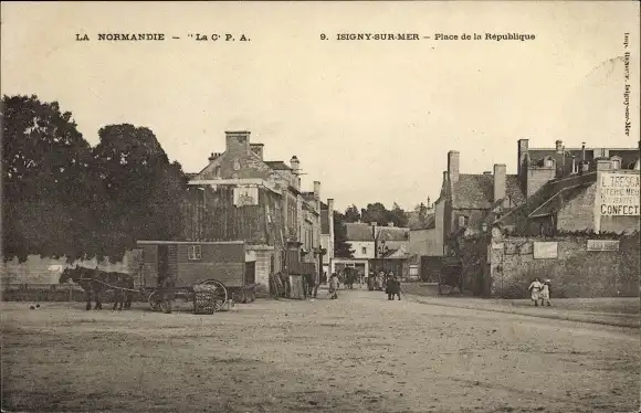 Ak Isigny sur Mer Calvados, Place de la République, charrette à chevaux