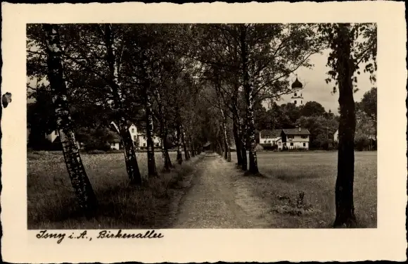 Ak Isny im Allgäu, Birkenallee, Blick zum Ort, Kirchturm