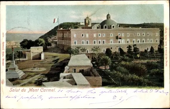 Ak Israel, Mount Carmel, Gebäude und Denkmal auf dem Berggipfel