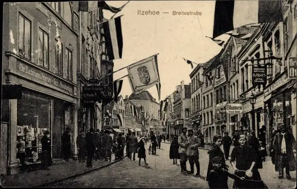Ak Itzehoe in Holstein, Breitestraße, Geschäfte, Fahnen