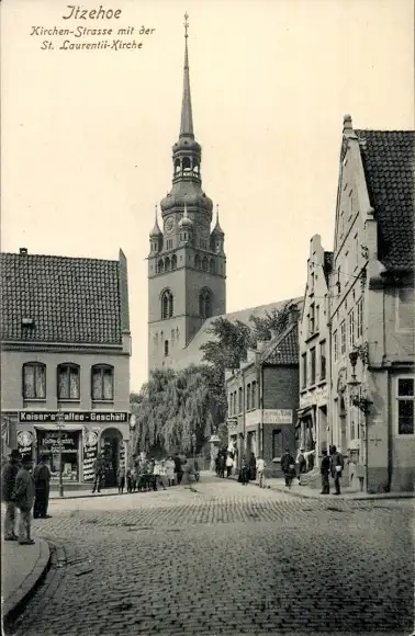 Ak Itzehoe in Holstein, Kirchenstraße mit der St. Laurentii-Kirche, Kaiser´s Kaffee Geschäft