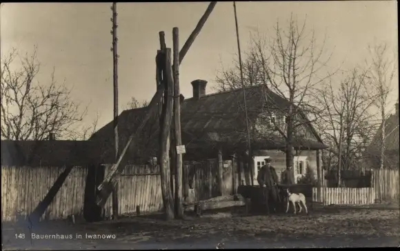Ak Iwanowo Russland, Bauernhaus, Deutscher Soldat, Brunnen