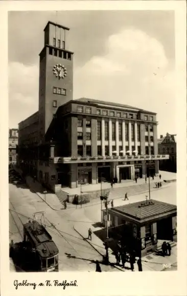 Ak Jablonec nad Nisou Gablonz an der Neiße, Blick auf das Rathaus, Straßenbahn
