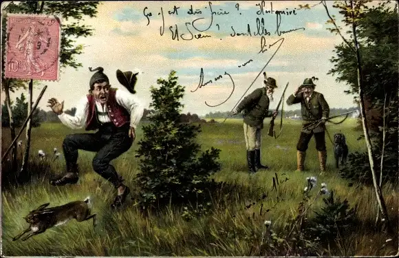 Ak Jagdmotiv, Jäger, angeschossener Mann, Hase, Jagdhund