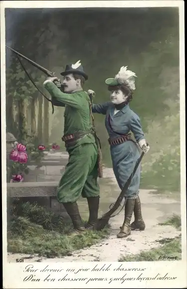 Ak Jagdmotiv, Mann und Frau mit Gewehren
