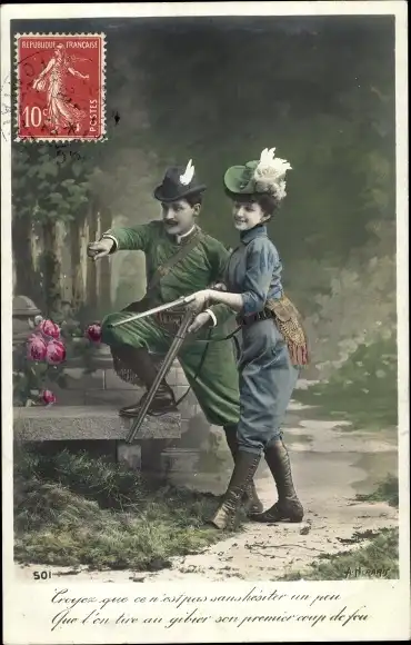 Ak Jagdmotiv, Mann und Frau mit Gewehren