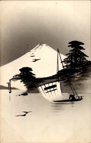 Ak Japan, Bergspitze, Vulkan, See, Segelboot