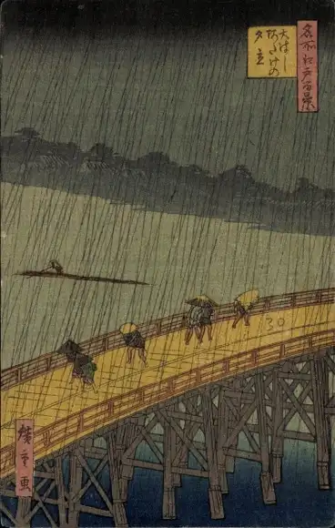 Ak Japan, Brücke, Regnerisches Wetter, Menschen auf dem Weg nach Hause