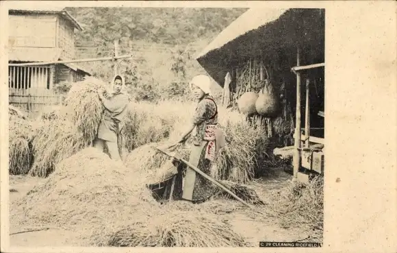 Ak Japan, Frau in Tracht, Heuernte