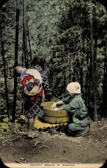 Ak Japan, Japanische Tracht, Frauen waschen Wäsche, Kinder