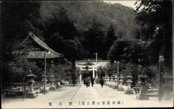 Ak Japan, Ortsansicht, Tempel, Im Hintergrund Wald