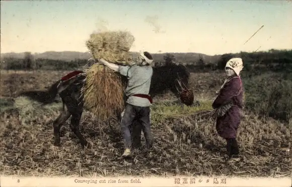 Ak Japan, Transport von geschnittenem Reis vom Feld