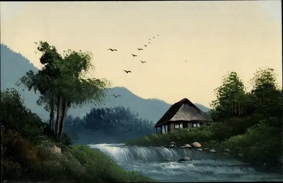 Ak Japan, Wohnhaus, Fluss, Fliegende Vögel