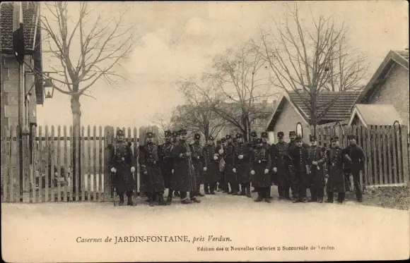 Ak Jardin Fontaine Meuse, Casernes, Soldats francais, portrait en groupe