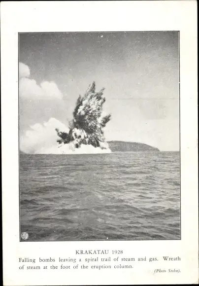 Ak Java Indonesien, Krakatau 1928, Falling bombs leaving a spiral trail of steam and gas