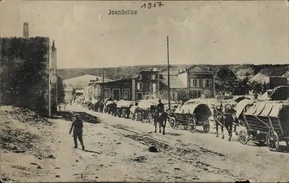 Ak Jeandelize Lothringen Meurthe et Moselle, zerstörte Häuser, Fuhrwerk Kolonne