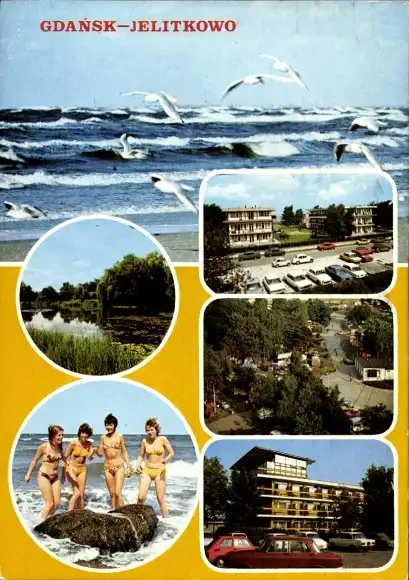 Ak Jelitkowo Glettkau Oliva Gdańsk Danzig, Möwen, Meer, Bademode, Parkplatz, Mewy Park